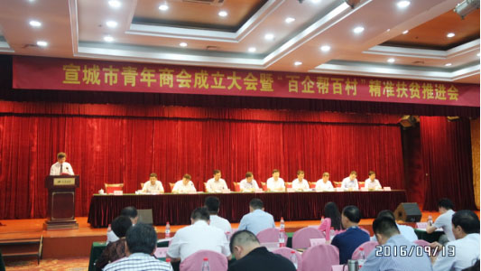 2016年9月13日,宣城市青年商會(huì)成立大會(huì)暨“百企幫百村”精準(zhǔn)扶貧推進(jìn)會(huì)在宣城市宣城賓館召開(kāi)。安徽省政協(xié)、省工商聯(lián)副主席施廣勇,宣城市委副書(shū)記嚴(yán)琛,市委常委、副市長(zhǎng)汪謙慎,市人大常委會(huì)副主任、民盟宣城市委會(huì)主委張玉峰,市政協(xié)副主席沈偉等市領(lǐng)導(dǎo)出席了會(huì)議,宣城市政協(xié)副主席、市工商聯(lián)主席程觀遠(yuǎn)主持會(huì)議。