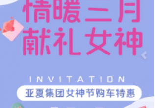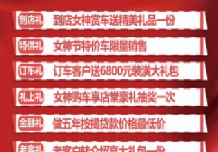 情暖三月 獻(xiàn)禮女神進(jìn)店購新車贈(zèng)女神禮品一份女神購新車 享專屬折扣訂車客戶送6800元裝潢禮包做五年按揭 價(jià)格更優(yōu)惠更多好禮盡在廣德汽車專賣店?活動(dòng)時(shí)間:3月1日